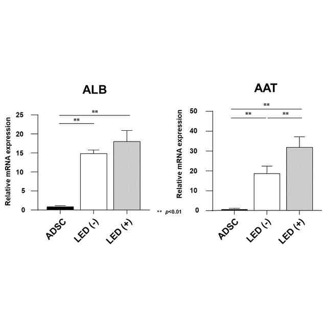 緑色LEDを照射されずに肝芽細胞から分化した肝細胞様細胞と比較して、