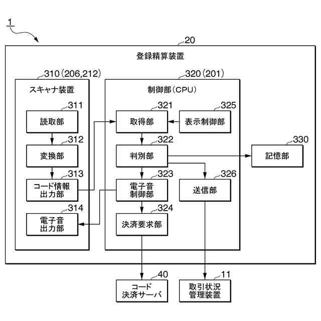 前記取得手段によって取得された前記コード情報が決済用コードを示す場合、第1の電子音出力態様により電子音の出力を制御し、前記コード情報が前記決済用コードを示さない場合、第2の電子音出力態様により電子音の出力を制御する電子音制御手段と、