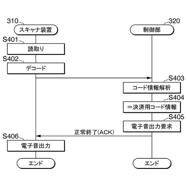 上述した課題を解決するために、本発明の他の態様であるシステムは、スキャナ装置と、精算装置とを備えるシステムであって、前記スキャナ装置は、シンボルコードを読み取る読取手段と、前記読取手段によって読み取られたシンボルコードをコード情報に変換する変換手段と、前記変換手段によって変換された前記コード情報を出力するコード情報出力手段と、所定の出力態様で電子音を出力する電子音出力手段と、を備え、前記精算装置は、前記コード情報出力手段から出力された前記コード情報を取得する取得手段と、前記取得手段によって取得された前記コード情報が決済用コードを示す場合、第1の電子音出力態様により電子音の出力を制御し、前記コード情報が前記決済用コードを示さない場合、第2の電子音出力態様により電子音の出力を制御する電子音制御手段と、を備えることを特徴とするシステムである。