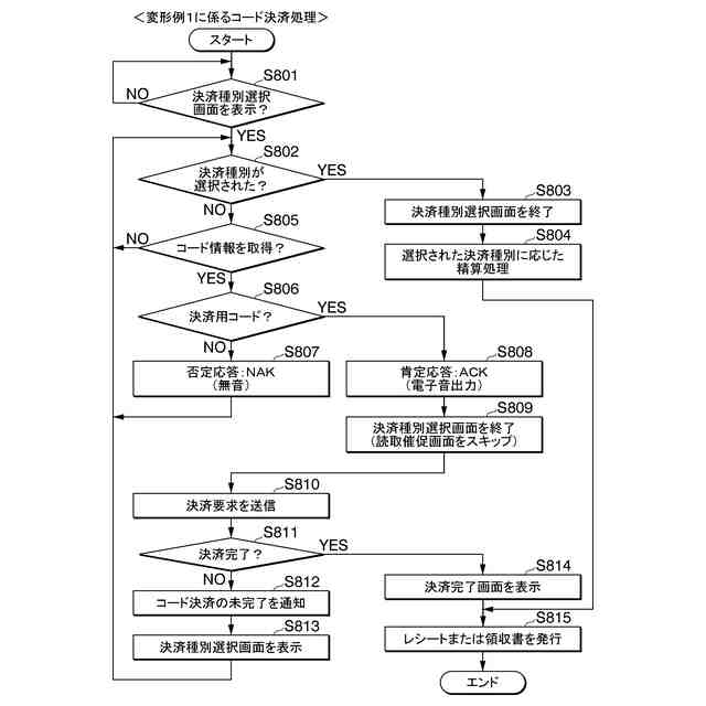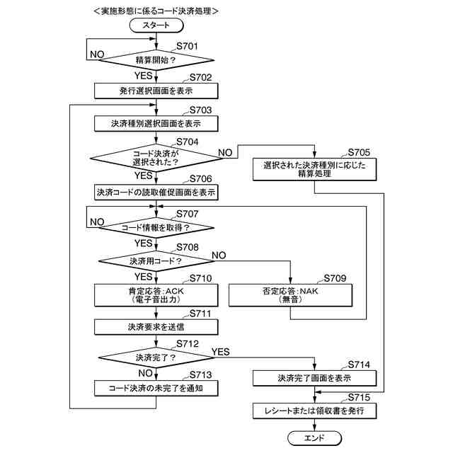 前記取得手段によって取得された前記コード情報が決済用コードを示す場合、第1の電子音出力態様により電子音の出力を制御し、前記コード情報が前記決済用コードを示さない場合、第2の電子音出力態様により電子音の出力を制御する電子音制御手段、