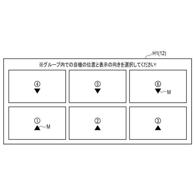 学習支援システム1にてグループ化された生徒が使用する複数台の関数電卓10(101~106)に各々の相対位置と表示の向きを入力させるための相対位置入力パターンH1を示す図である。