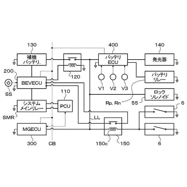 図1は、本開示の電動車両100を示す概略構成図である。同図に示す電動車両100は、複数の交換式のバッテリ10と、常開型の機械式リレー(有接点リレー)であるシステムメインリレーSMRと、電力制御装置(以下、「PCU」という。)110と、モータジェネレータMGとを含むバッテリ電気自動車(BEV)である。PCU110は、モータジェネレータMGを駆動するインバータ(駆動回路)、昇圧コンバータ、DC/DCコンバータ等を含むものである。モータジェネレータMGは、同期発電電動機(三相交流電動機)である。