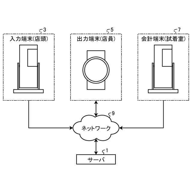入力端末3は、店内の姿見(鏡)を使用する顧客による、1以上の商品の試用(試着)の申し込みにかかる操作を受け付ける。入力端末3が試着の申し込みを受け付けると、店員が出力端末5を介して情報を受け取って、試着の準備を行う。本実施形態の入力端末3は、姿見(鏡)としての機能とタッチパネル付き端末装置としての機能を併せ持った、スマートミラーである。実施にあたってはこれに限らず、例えば、店内の姿見のある場所に設けられたタブレット型端末装置(或いはスマートフォン)等であっても構わない。