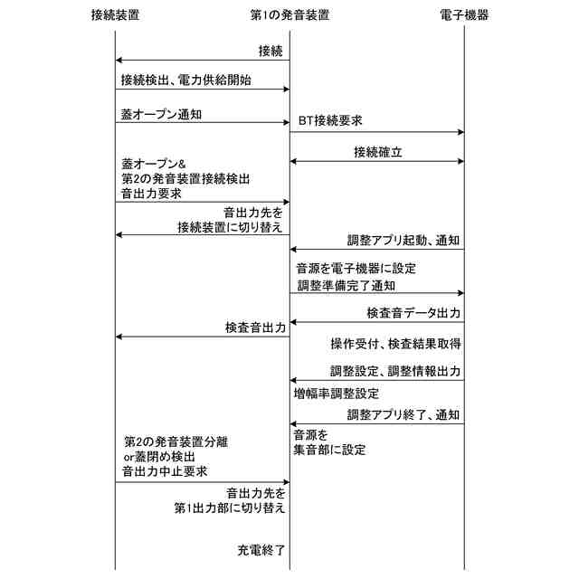 検査時における接続装置、第1の発音装置及び電子機器の間での信号のやり取り及び動作を説明するシーケンス図である。