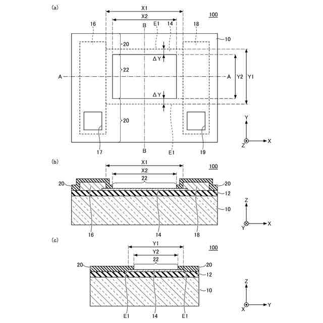 図1(a)は、本発明の第1実施形態に係るセンサ素子を示す平面図、図1(b)及び図1(c)は、それぞれ図1(a)のA-A断面図及びB-B断面図である。基板10の厚さ方向をZ方向、電極16と18の配列方向をX方向、X方向及びZ方向に交差する方向をY方向とする。