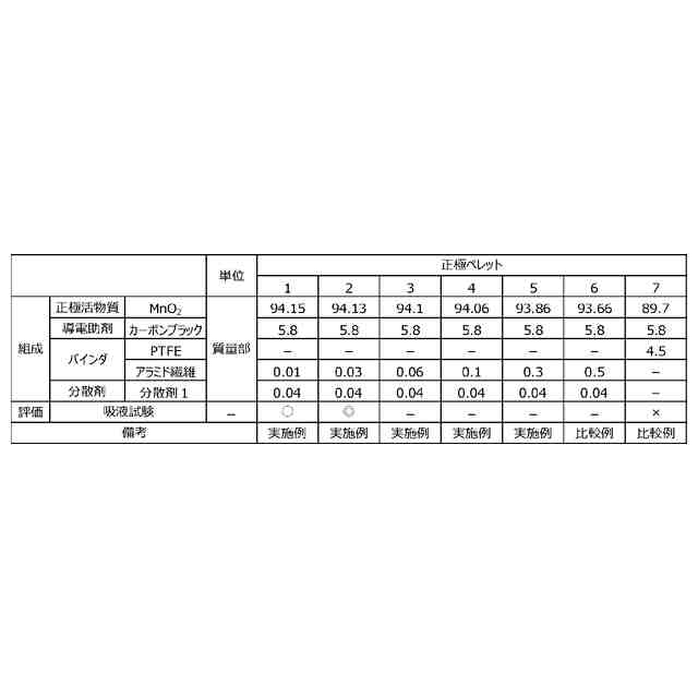 本発明者らは、鋭意検討した結果、二酸化マンガンを用いた電極のバインダとして、アラミド繊維(好ましくはミクロフィブリル化したアラミド繊維)を用いることにより、繊維化したアラミドが電極中で網目状構造を形成しうること、それにより、少量でも電極活物質や導電助剤を良好に結着させることができることを見出した。それにより、従来のフッ素樹脂を用いなくても、従来と同等以上の高いエネルギー密度を有する電池が得られることを見出した。