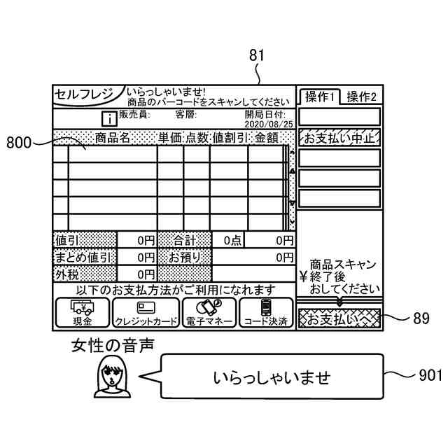 前記音声出力手段は、前記商品登録処理または前記会計処理の途中で、前記顧客による操作が規定の時間以上実行されない場合、前記第1の音声及び前記第2の音声とは異なる第3の音声を出力する、