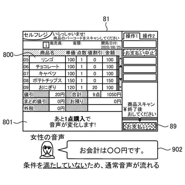 図9は、第2の実施形態に係る規定の条件が満たされた場合における商品登録画面及び音声メッセージの一例を示す図である。