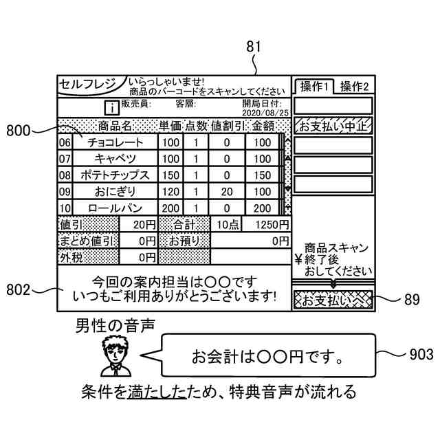 図11は、第3の実施形態に係る規定の条件が満たされた場合における商品登録画面800及び音声メッセージの一例を示す図である。