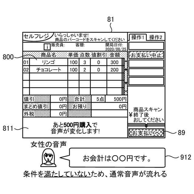 図8は、第2の実施形態に係る規定の条件が満たされていない場合における商品登録画面及び音声メッセージの一例を示す図である。