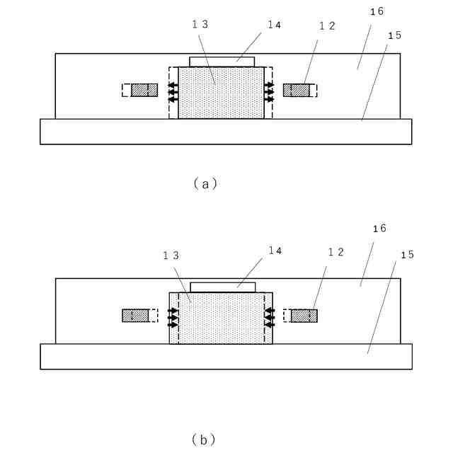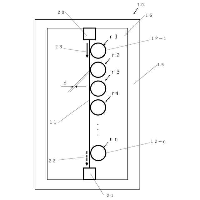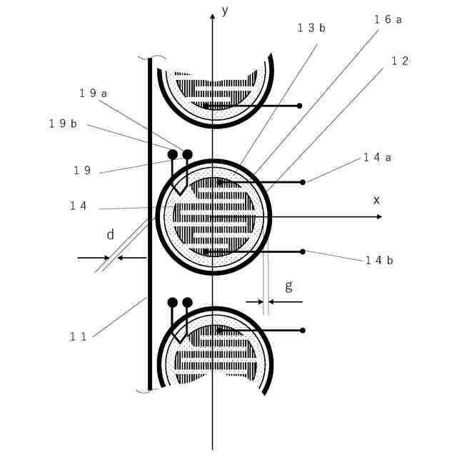 そのマイクロ光共振器を図15に示す。図15(a)は導波路の平面図であり、図15(b)は、x軸の断面図を表している。30aはシリコン基板29上に成膜された二酸化ケイ素(SiO2)で形成された第1のクラッド層である。この第1のクラッド層30aの一部をエッチング除去して周回型光共振器である共振器32および導波路31が埋め込まれている、その上に第2のクラッド層30bが形成される。共振器32はリング状であり、導波路31は直線で構成される。共振器32と導波路31は僅かな隙間dを介して配置されている。なお、隙間dのz方向側面は、ドライエッチングで加工された面によって形成されている。また、共振器32と導波路31は窒化シリコンで構成されている。