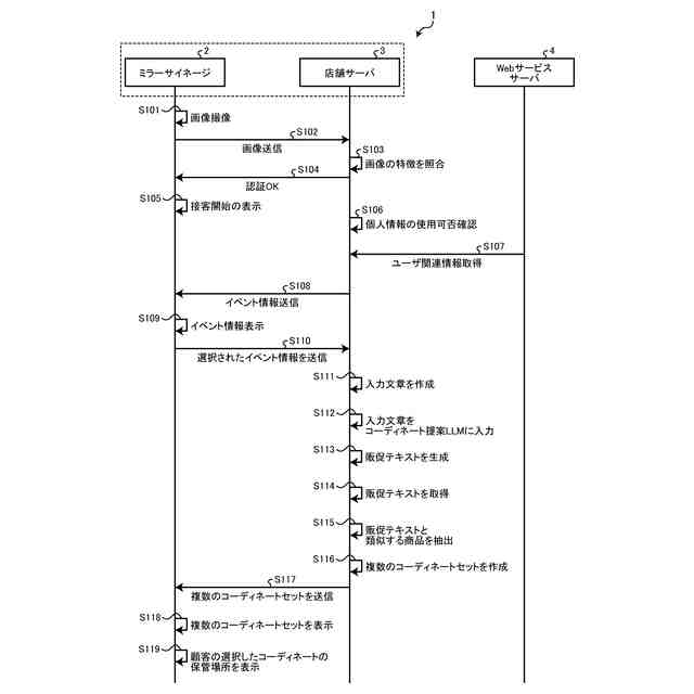 図1は、実施形態に係るコーディネート提案システム1の概略構成を示す模式図である。コーディネート提案システム1は、ミラーサイネージ2と、店舗サーバ3と、Webサービスサーバ4とを有する。
