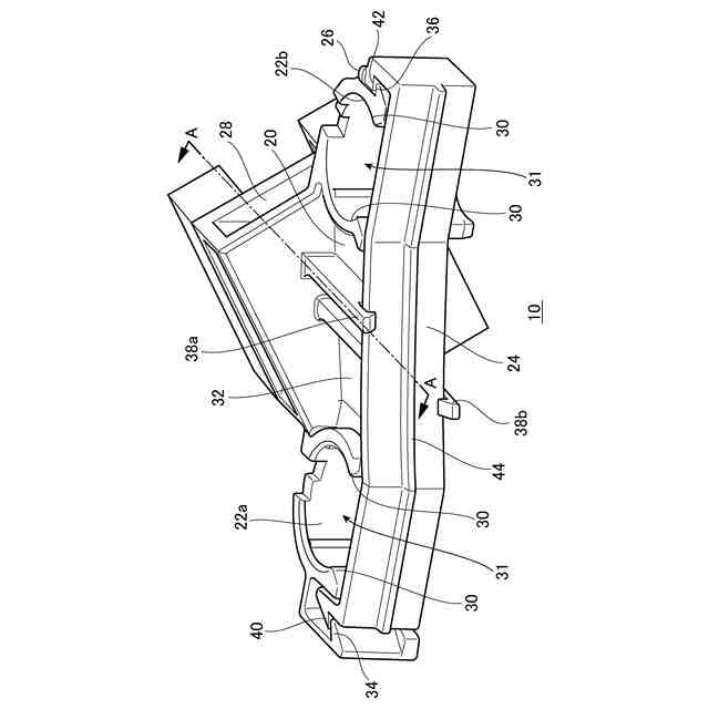 図1は、実施例の保持構造1の斜視図である。また、図2は、実施例の保持具10の斜視図である。保持構造1は、保持具10および第1長尺部材12aおよび第2長尺部材12b(これらを区別しない場合「長尺部材12」という)により構成される。