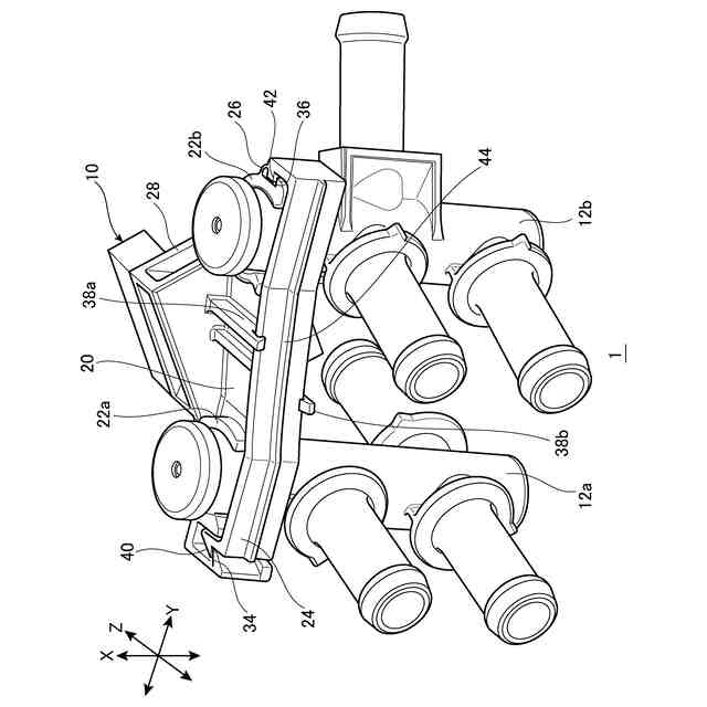 保持具10は、複数の長尺部材12を保持可能である。長尺部材12は、例えば車両に用いられる液体を移動可能にする配管であり、配管同士を連結するジョイントとして機能する。長尺部材12の側面には、他の配管を接続するための筒が張り出しており、第1長尺部材12aと第2長尺部材12bとでは側面の筒の形状が異なる。