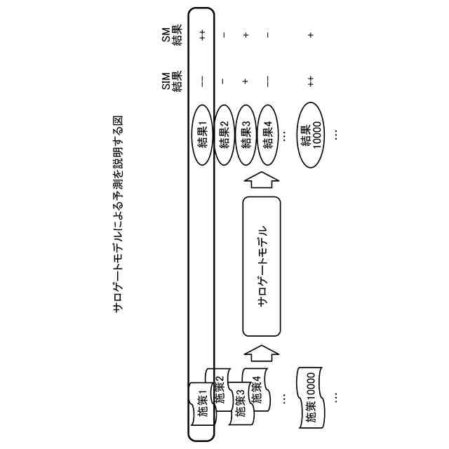 近年では、シミュレーションよりも精度が劣るが計算時間が短いシミュレーションの代替モデルの一例であるサロゲートモデルが知られている。また、複雑な社会シミュレーションの代理モデルの生成技術としては、多量の社会データをニューラルネットワークで学習させた学習済みモデルを代理モデルとする技術が知られている。