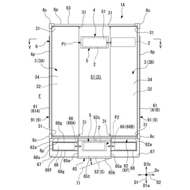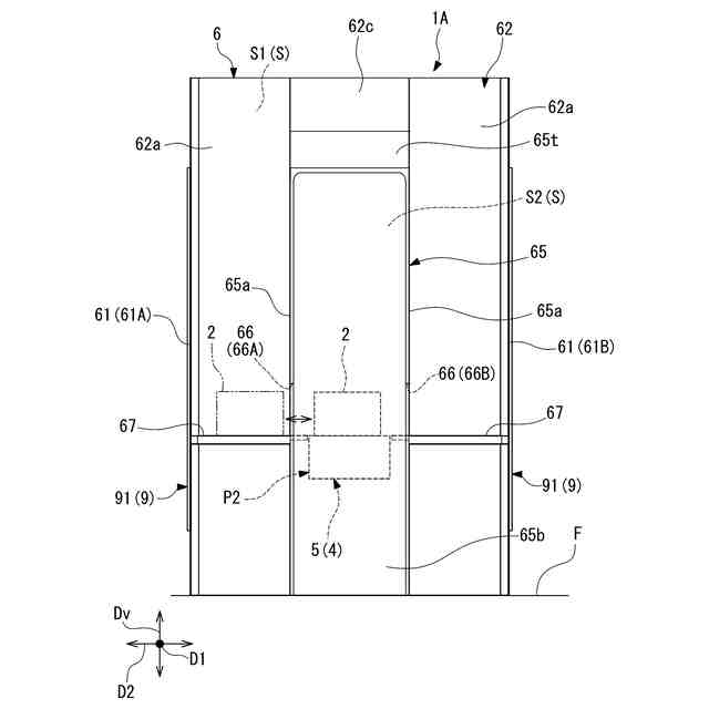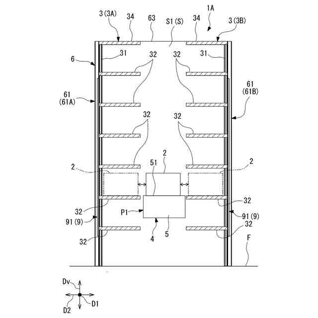 一方の前記収納装置の前記突出部と、他方の前記収納装置の前記突出部とが、前記水平第一方向で互いに離間した状態で向かい合わせて配置されている