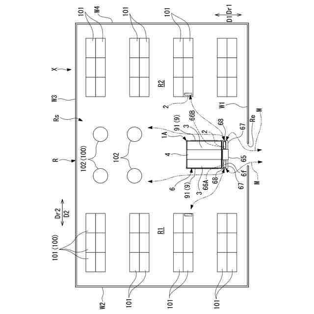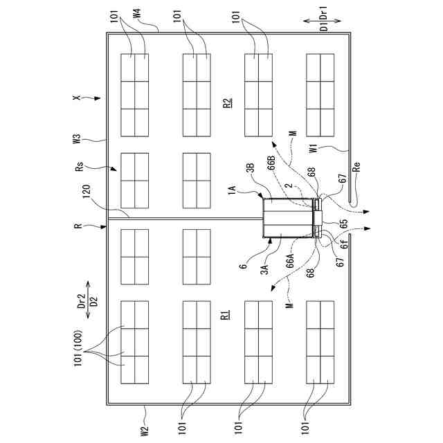 (1)本発明の一態様に係る什器システムは、施設の壁で囲われた執務室内に配置され、物品を収容可能な収容ボックスを複数収納する収納装置と、前記執務室内に配置され、前記収納装置から取り出された前記収容ボックス内の物品を利用可能な利用什器と、を備え、前記収納装置は、前記収容ボックスを床面と平行な水平第一方向に複数並べて収納可能な棚部を、上下方向に複数段備える収納棚と、前記収納棚に対し、水平第一方向および上下方向に交差する水平第二方向に隣り合って配置され、前記収納棚に収納された前記収容ボックスを水平第二方向に沿って出し入れ可能、かつ、前記収容ボックスを水平第一方向および上下方向に搬送可能な搬送器を備えた搬送機構と、前記収納棚、および前記搬送機構の少なくとも側方全周を囲み、前記収納棚および前記搬送機構が収納された収納空間を形成する収納空間形成部と、を備え、前記収納空間形成部の垂直壁面には、前記収納空間の内外を連通させるとともに、前記搬送器により搬送される前記収容ボックスを前記収納空間の内外で水平方向に出し入れ可能な開口が形成されている。