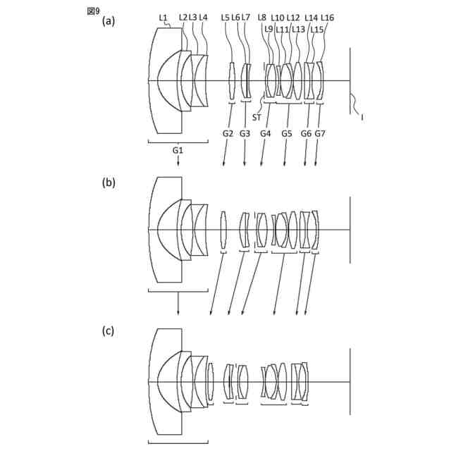 (a)は第9実施例の変倍光学系の広角端状態における断面図であり、(b)は第9実施例の変倍光学系の中間焦点距離状態における断面図であり、(c)は第9実施例の変倍光学系の望遠端状態における断面図である。