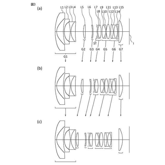 (a)は第14実施例の変倍光学系の広角端状態における断面図であり、(b)は第14実施例の変倍光学系の中間焦点距離状態における断面図であり、(c)は第14実施例の変倍光学系の望遠端状態における断面図である。