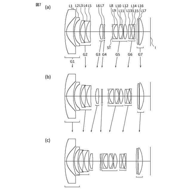 (a)は第7実施例の変倍光学系の広角端状態における断面図であり、(b)は第7実施例の変倍光学系の中間焦点距離状態における断面図であり、(c)は第7実施例の変倍光学系の望遠端状態における断面図である。