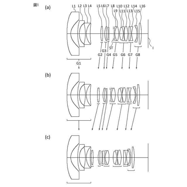 (a)は第14実施例の変倍光学系の広角端状態における断面図であり、(b)は第14実施例の変倍光学系の中間焦点距離状態における断面図であり、(c)は第14実施例の変倍光学系の望遠端状態における断面図である。