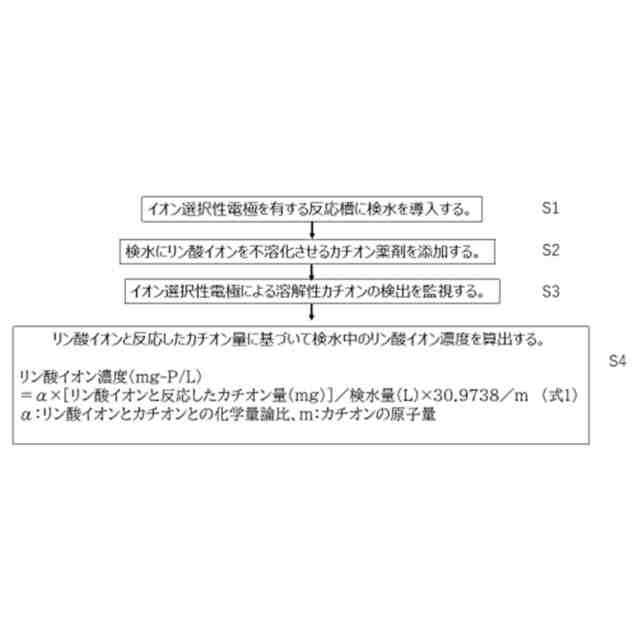 検水に、リン酸イオンを不溶化させるカチオン薬剤を所定濃度M(mg/L)、所定量A1(L)で添加し、イオン選択性電極による溶解性カチオンの濃度を測定し、溶解性カチオン濃度が変動しなくなる点における溶解性カチオン濃度M1(mg/L)を把握し、
