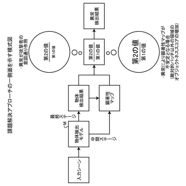 第1の案では、物体検出モデルへの入力シーンから検出された物体検出結果と、XAI技術によって得られる前記入力シーンに対する顕著性マップとに基づいて、前記入力シーン全体に対する顕著性マップの値を示す第1の値及び前記入力シーンにおける前記検出された物体の領域以外の領域における顕著性マップの値を示す第2の値を算出し、算出された前記第1の値及び前記第2の値に基づいて、前記入力シーンの異常を検出する、処理をコンピュータに実行させる。