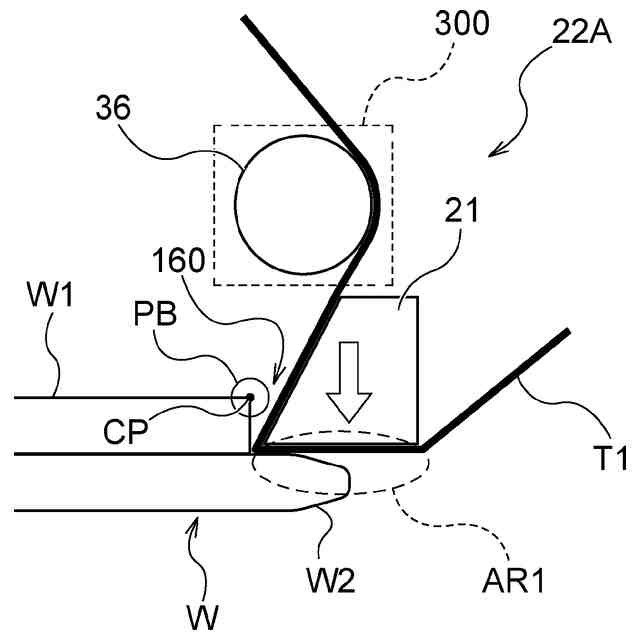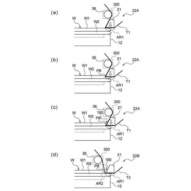 このようなナイフエッジ部は、物理的な接触により欠けやすい。さらに、積層基板の搬送時において、ナイフエッジ部を原因として積層基板自体が破損するおそれがある。そこで、ナイフエッジ部の形成を防止するために、積層基板を回転させながら、研磨具(例えば、研磨テープ)を積層基板の周縁部に押し付けて、第1基板の周縁部を除去し、積層基板の周縁部に窪みを形成する。