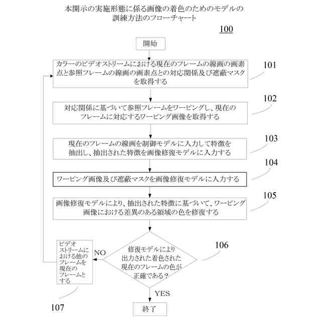 【解決手段】訓練方法は、カラーのビデオストリームにおける現在のフレームの線画の画素点と参照フレームの線画の画素点との対応関係及び現在のフレームの画像と参照フレームの画像との差異のある領域を示す遮蔽マスクを取得するステップと、対応関係に基づいて参照フレームをワーピングし、ワーピング画像を取得するステップと、現在のフレームの線画を制御モデルに入力して特徴を抽出し、抽出された特徴を画像修復モデルに入力するステップと、ワーピング画像及び遮蔽マスクを画像修復モデルに入力するステップと、ワーピング画像における差異のある領域の色を修復するステップと、を含み、画像修復モデルが正確に着色された現在のフレームを出力するように以上のステップを反復的に実行することによって、画像修復モデル及び制御モデルを訓練する。