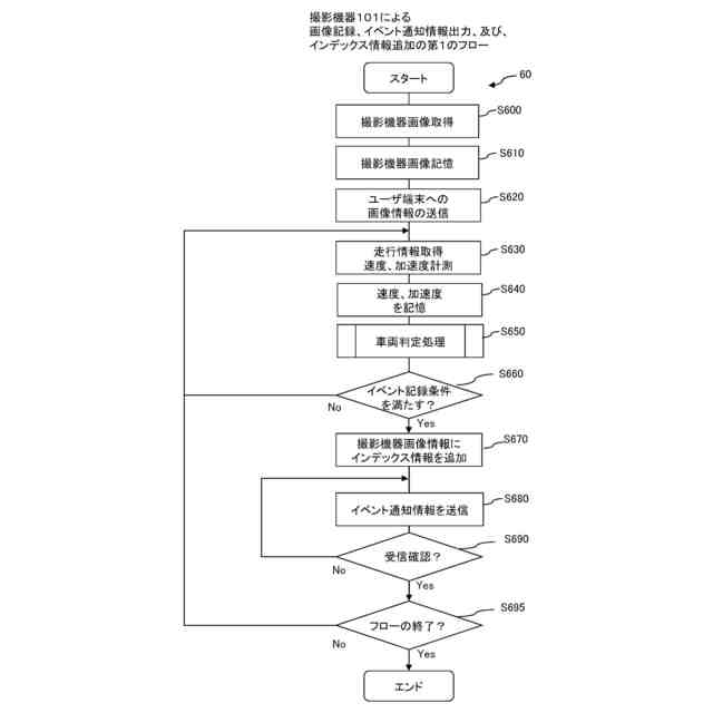 図6は、撮影機器101による画像記録、イベント通知情報出力、及び、イ ンデックス情報追加の第1のフロー60の例である。