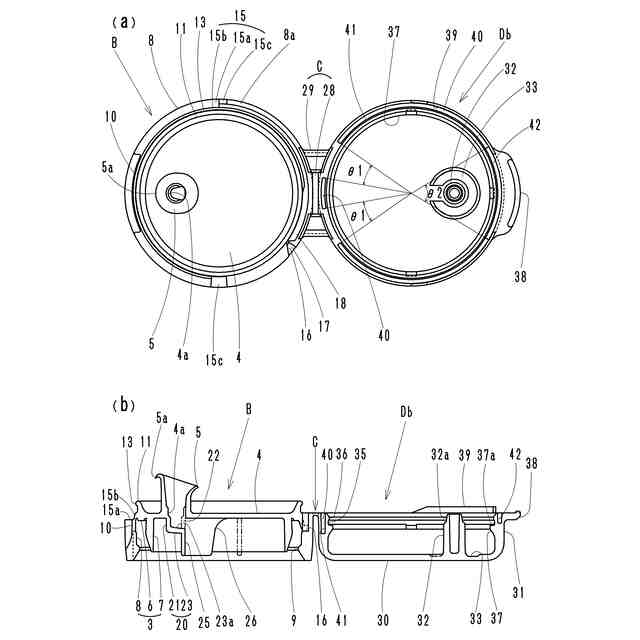 蓋体は、頂壁と、頂壁の周縁部から垂設される側周壁と、側周壁の外周下部のヒンジ部と反対側に形成される摘み部と、側周壁下面のヒンジ部と反対側外周縁から垂設され、閉蓋時に段凹部を覆う被覆壁とを備え、