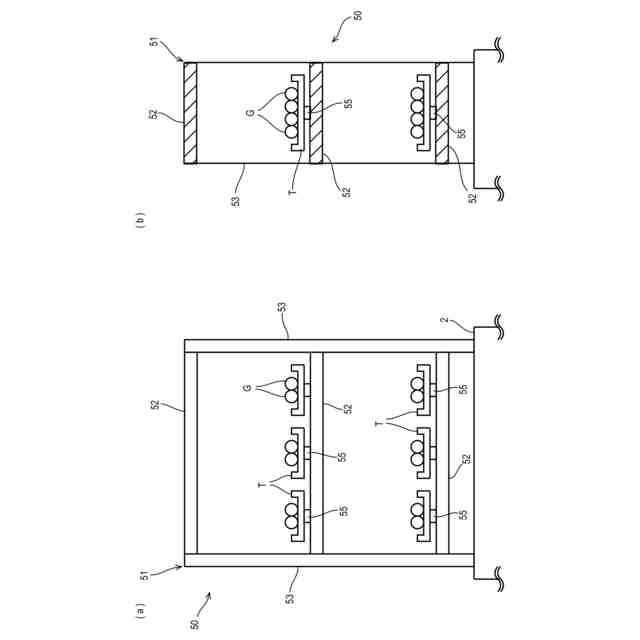 (a)本発明の第2実施形態に係る販売システムが有する陳列装置の正面図、(b)当該陳列装置の側面断面図