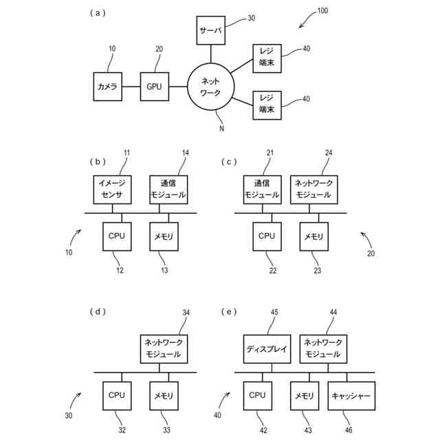 (a)上記販売システムが有するハードウェア構成図、(b)当該販売システムが有するカメラのハードウェア構成図、(c)当該販売システムが有するGPUのハードウェア構成図、(d)当該販売システムが有するサーバのハードウェア構成図、(e)当該販売システムのレジ装置のハードウェア構成図
