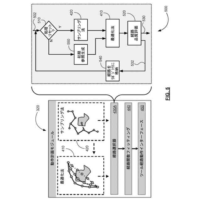図5は本開示の実施形態による図4の動作計画モジュールにてサンプリング及び最適化動作計画の直列組み合わせを用いる経路選択方法のフローチャートである。
