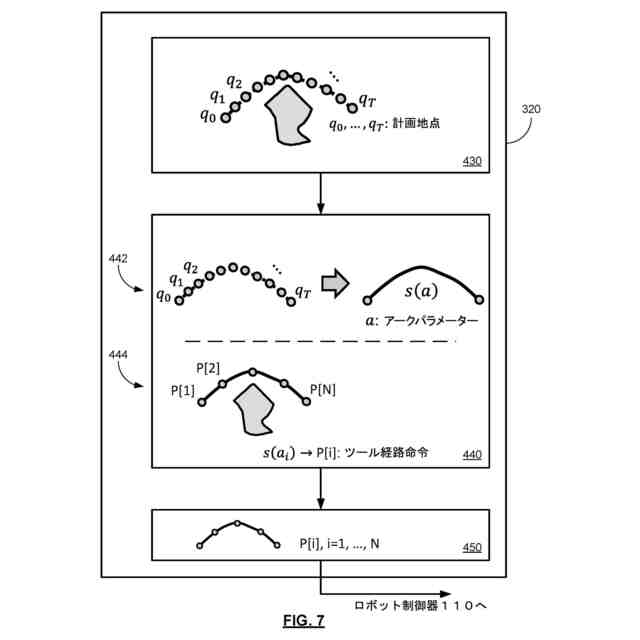 前記命令地点のセットを前記ロボット制御器に転送し前記命令地点に基づいて前記ロボットの関節動作を計算することと、ここで前記命令地点の削減されたセットの計算は前記計画経路の前記経由地点をフィットさせるためにスプライン曲線関数を計算することを含み、ここで0から1の範囲の値を持つアーク長パラメーターは前記スプライン曲線関数上の位置を定義し、