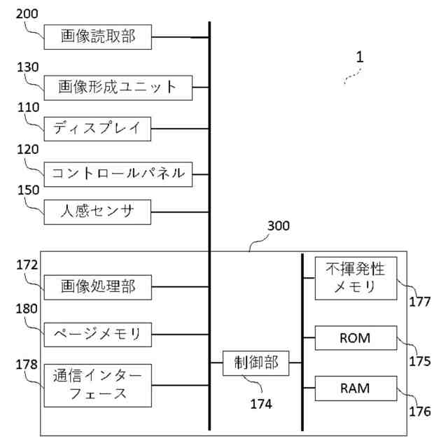 画像形成装置1は、ディスプレイ110、コントロールパネル120、画像形成ユニット130、画像読取部200、人感センサ150、システムコントローラ300を備える。