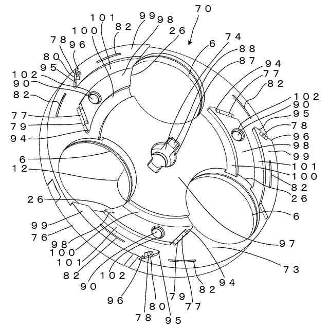 金属製の回転体に比べ、樹脂製の回転体は、軽量化できるが耐久性が劣る。そこで、回転体の一部を金属製にすることが考えられた。その一つの方法として、一体成形によって樹脂の中に金属板が挿入された上述の回転体がある。また別の方法として、特開2003-20127号公報に記載された回転ディスクが知られている。この回転ディスクは、金属製の押動突起を備えた押出ディスクが、樹脂ディスクにネジによって固定されている。