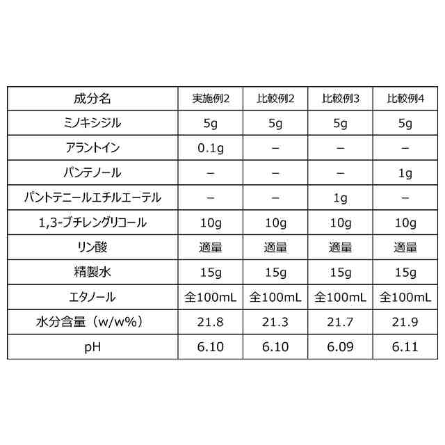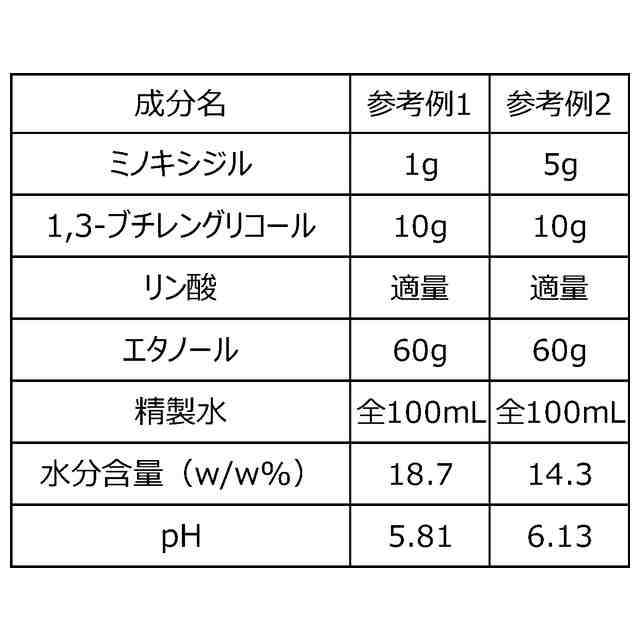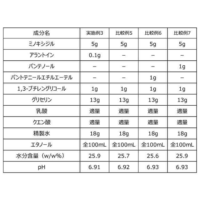 ミノキシジルを含有する製剤中のミノキシジルが頭皮から効率的に吸収されるためには、製剤中のミノキシジルが溶解状態で存在し、結晶などが生じないことが好ましい。そして、ミノキシジルを含有する製剤が頭皮の表面になじみ、広がることが重要である。しかし、水分を多く含む製剤は疎水的な皮膚との間に表面自由エネルギーが働くため、滴の状態を保ち、肌表面に広がりにくい。また、粘度の高い製剤においては、適用時に手指で均一に塗り広げることが可能であるが、粘度の低い製剤においては塗布後なじませにくいという課題があった。肌なじみを向上する技術として、例えばポリエーテル変性シリコーン又はポリグリセリン変性シリコーン、及びショ糖脂肪酸エステルを利用する方法が提案されている(特許文献3)。また、特許文献4には、ミノキシジルの濃度が高まると、頭皮に製剤が広がる感じが悪化することが示されている。
