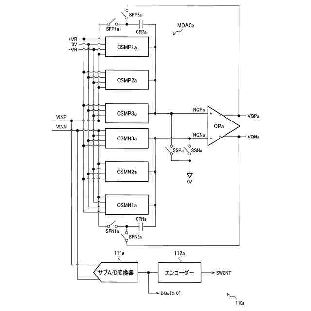 パイプラインステージ110aは、A/D変換回路100への入力電圧VINをサンプリングし、サンプリング電圧をA/D変換し、A/D変換の結果をデジタル値DQa[2:0]として出力する。パイプラインステージ110aは、サンプリング電圧と、デジタル値DQa[2:0]をD/A変換した電圧との差分にゲインを乗じ、その結果を出力する。デジタル値DQa[2:0]は、2.5ビットのレンジを有する。即ち、デジタル値DQa[2:0]のとり得る値は、000b、001b、010b、011b、100b、101b、110bの7値である。数値末尾の「b」は2進数を意味する。