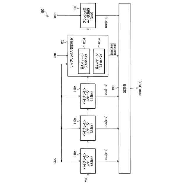 図1は、A/D変換回路の第1構成例である。A/D変換回路100は、パイプラインステージ110a、110b及び110cと、サイクリックA/D変換器120と、フラッシュ型A/D変換器130と、加算器190とを含む。
