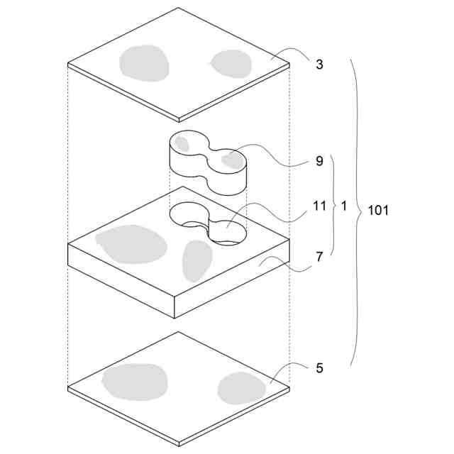 クッション本体層1は、クッション101の本体部を成す中心的部分であり、その厚みはクッション101の厚みの大半を占めている。クッション本体層1は厚板状であって、上下両主面を有している。上部クッション層3は、クッション本体層1の上主面を覆うように配置される。他方の下部クッション層5は、クッション本体層1の下主面を覆うように配置される。このように、クッション本体層1、上部クッション層3、下部クッション層5は、層を成して重なり合っている。
