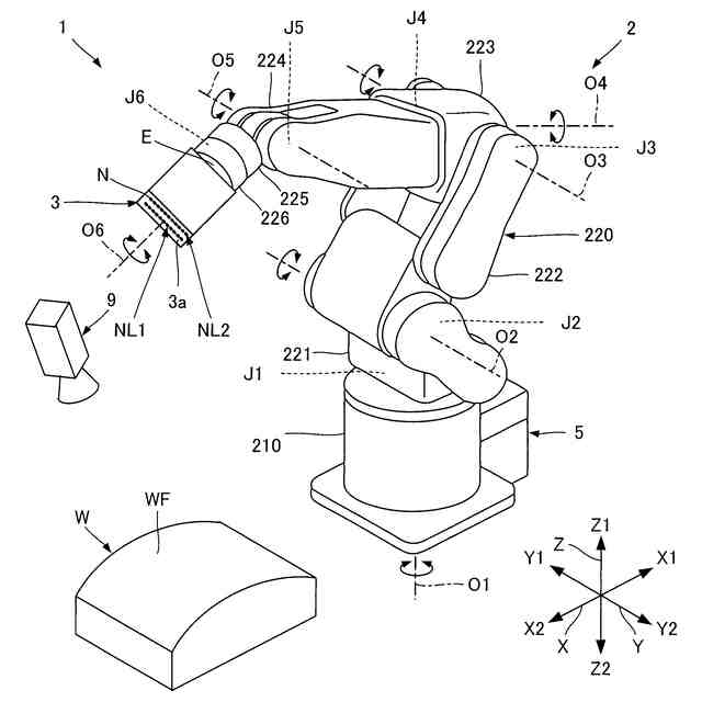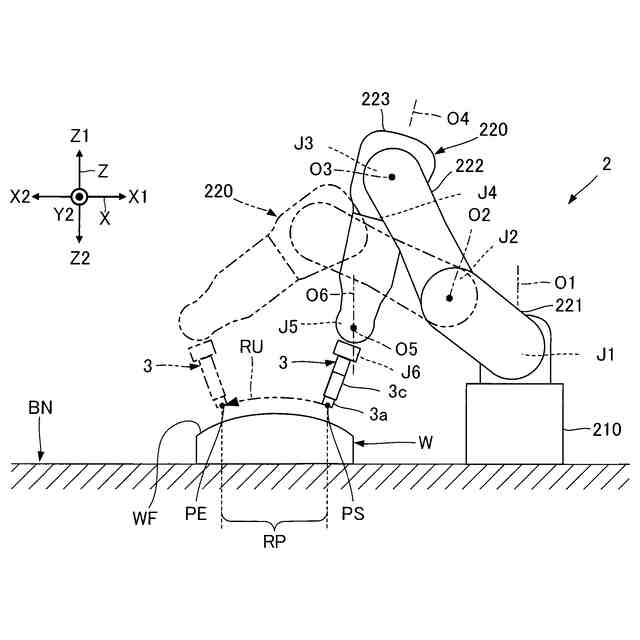 ここで、X軸、Y軸およびZ軸は、後述のロボット2が設置される空間に設定されるワールド座標系の座標軸に相当する。典型的には、Z軸が鉛直な軸であり、Z2方向が鉛直方向での下方向に相当する。当該ワールド座標系には、ロボット2の後述の基部210の位置を基準とするベース座標系がキャリブレーションにより対応付けられる。以下では、便宜上、ワールド座標系をロボット座標系として用いてロボット2の動作を制御する場合が例示される。