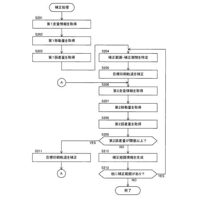前記第2誤差量が閾値以上である場合、補正量を調整して前記補正期間における前記目標印刷軌道を補正する、