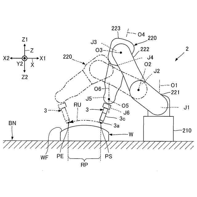ここで、X軸、Y軸およびZ軸は、後述のロボット2が設置される空間に設定されるワールド座標系の座標軸に相当する。典型的には、Z軸が鉛直な軸であり、Z2方向が鉛直方向での下方向に相当する。当該ワールド座標系には、ロボット2の後述の基部210の位置を基準とするベース座標系がキャリブレーションにより対応付けられる。以下では、便宜上、ワールド座標系をロボット座標系として用いてロボット2の動作を制御する場合が例示される。