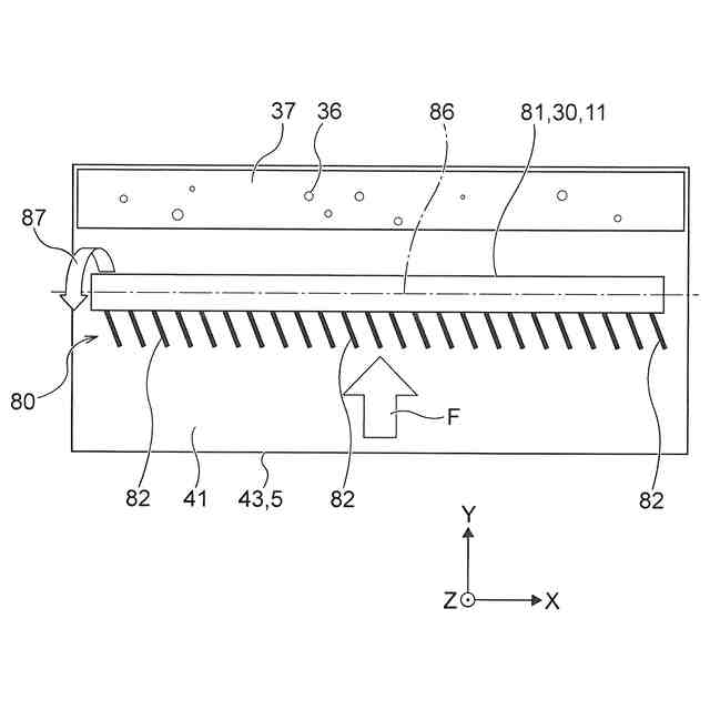 前記軸は、前記搬送方向に対して傾斜して配置される、
