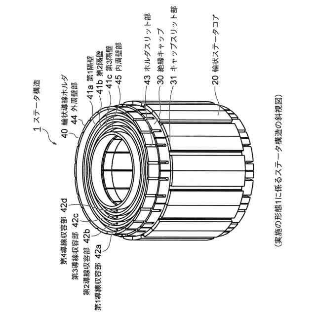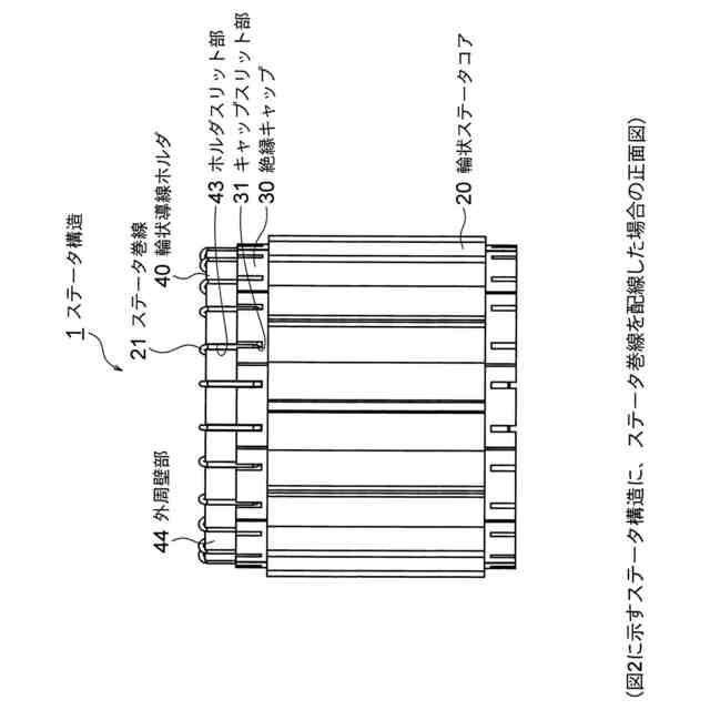 各絶縁キャップは、輪状ステータコアの軸方向に沿う方向の端部に形成され、ステータ巻線又は導線が収容されるキャップスリット部を有し、輪状導線ホルダは、径方向外側の、キャップスリット部に接続される位置に、ステータ巻線又は導線が収容されるホルダスリット部を有してもよい。