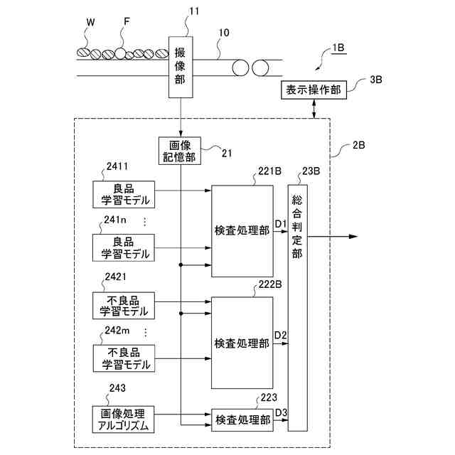 上記[1]の構成によれば、予め想定できる不良品については学習を行うことにより、不良品学習モデルを用いる検査処理部で精度よく不良品であると判定することができ、想定外であり学習されていない不良品については、良品学習モデルを用いる検査処理部で不良品であると判定することができる。このため、検査精度向上を図ることができる。
