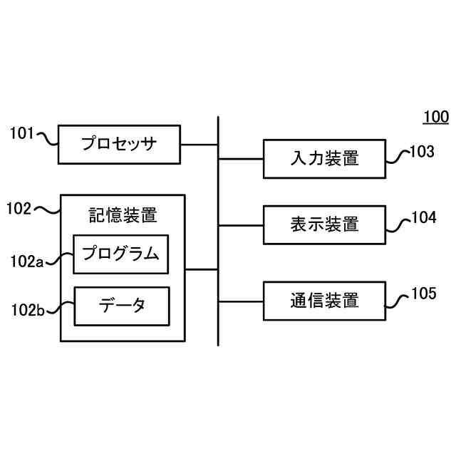 情報処理装置100は、図2に示すように、プロセッサ101、記憶装置102、入力装置103、表示装置104、通信装置105を備える。プロセッサ101は、例えば、CPU(Central Processing Unit)などを含み、記憶装置102に記憶されているプログラム102aを実行する。なお、プロセッサ101には、GPU(Graphics processing unit)、ASIC(Application Specific Integrated Circuit)、FPGA(Field-Programmable Gate Array)、DSP(Digital Signal Processor)などの任意の電気回路が含まれてもよい。