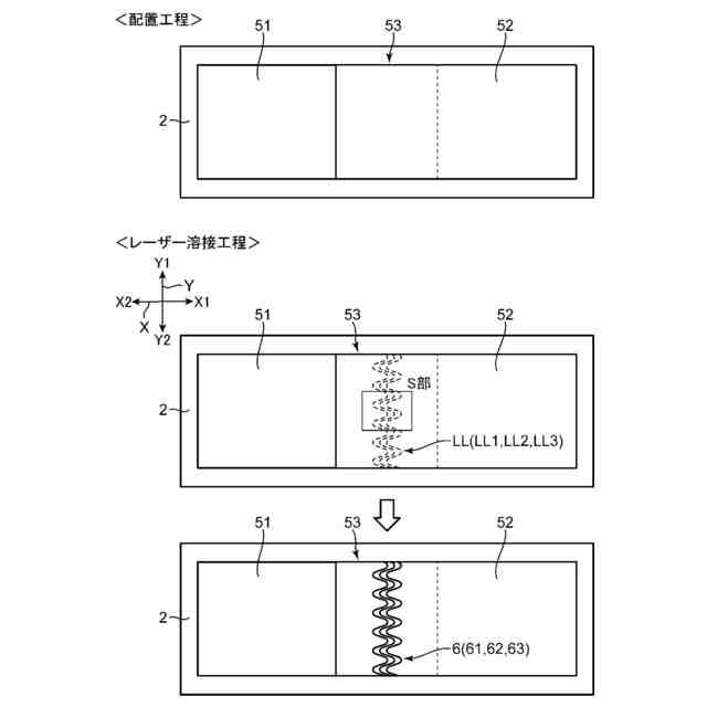そこで、レーザー溶接工程では、直交方向に互いに離れて複数の照射軌跡を描くとともに、所定方向で見て、直交方向に隣り合う一方の照射軌跡の振幅の範囲内に他方の照射軌跡を重ならせて、重複部分に対してレーザー光を照射する。これにより、所定方向で見て、直交方向に隣り合う一方の照射軌跡の振幅の範囲内の直線領域に、他方の照射軌跡の山又は谷の頂点を含む非直線領域を重ねることが可能である。このため、複数の照射軌跡に沿って形成される各溶接部において、所定方向で見て、溶接体積の小さい直線領域を溶接体積の大きい非直線領域で補強することができる。これにより、第1金属板と第2金属板との異種金属板同士の接合強度を高めることが可能となる。