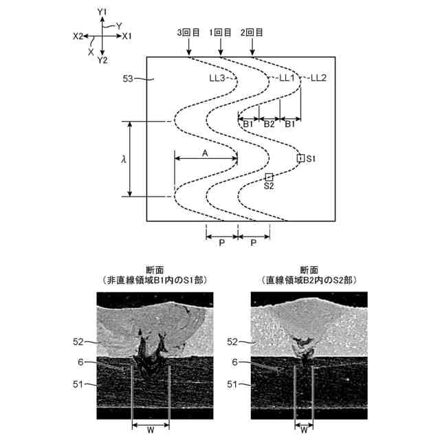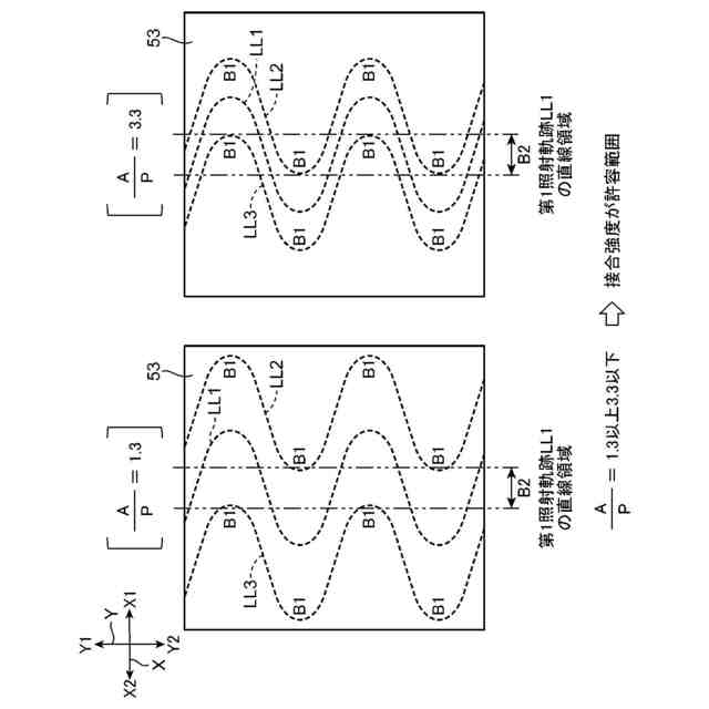 この態様では、所定方向で見て、直交方向に隣り合う一方の照射軌跡の振幅の範囲内の直線領域に他方の照射軌跡の非直線領域を、より確実に重ねることが可能である。このため、複数の照射軌跡に沿って形成される各溶接部において、所定方向で見て、溶接体積の小さい直線領域を溶接体積の大きい非直線領域で、より確実に補強することができる。